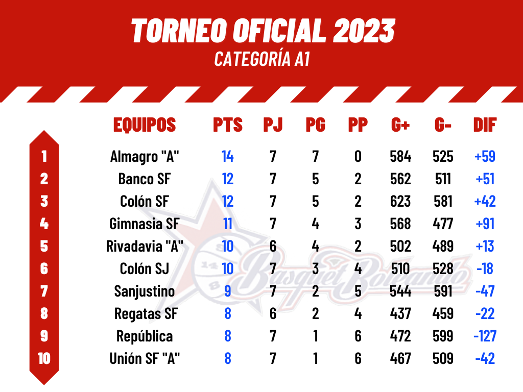 ALMAGRO (Esperanza) “A” (97): Matías Felcaro 3; Enzo Durigon 4; Leonardo Strack 17; Mateo Spies 7; Valentín Depetris 16 (FI); Franco Parola 6; Diego Collomb 10; Facundo Viola 5; Rodrigo Riquelme 22; Federico Pfeiffer 7. DT: Leandro Spies.