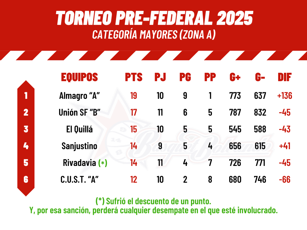 Rivadavia Juniors superó a Unión de Santa Fe “B” por 72 a 63 y sumó su cuarto festejo en el Pre-Federal 2025. Luego de una primera mitad cambiante, los pupilos de Schifitto en la segunda mitad con pasajes de alto vuelo lograron tomar el comando tanto en el tramite como en el tanteador para llevarse un anhelado triunfo. Los tatengues, por su parte, fueron irregulares en su accionar y contaron con un plantel diezmado que lo sintieron por muchos pasajes del encuentro. Mauro Natta con 20 puntos fue el goleador del juego. Agustín Ferrari sobresalió en la ofensiva local con 15 unidades.