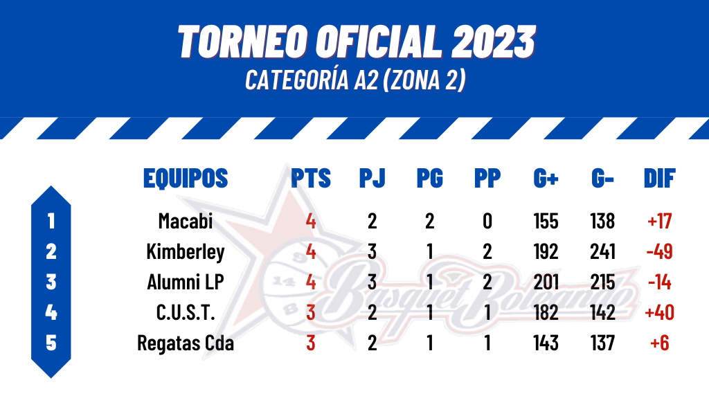 Macabi derrotó 71-62 a Alumni en Laguna Paiva en el cotejo que cerró la tercera jornada de la zona 2 en el Torneo Oficial A2. A partir del segundo cuarto los dirigidos por Bernardi impusieron condiciones desde el juego, lo reflejaron en el score con el correr del encuentro y nunca le permitieron al rival acercarse para poner en riesgo el resultado final. Álvaro Motura (20) y Nicolás Char (23) fueron los goleadores en cada conjunto.