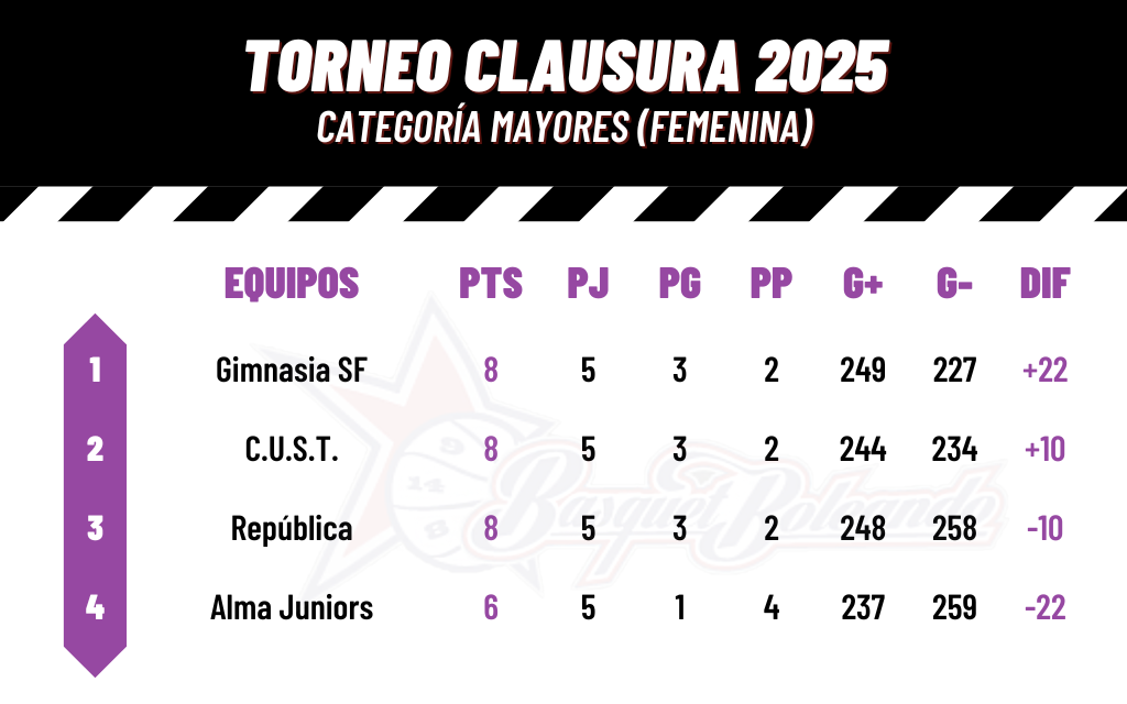 Gimnasia y Esgrima (3-2) le ganó 52-46 a Alma Juniors de Esperanza (1-4) como local y regresó al triunfo tras dos caídas consecutivas. Gianella Ramassotto (16) fue la goleadora mensana, bien secundada por Cora Minetti con 11 (más 10 rebotes). En la visita, Mía Andereggen se volvió a despachar con otro doble-doble: 16 puntos y 14 rebotes.