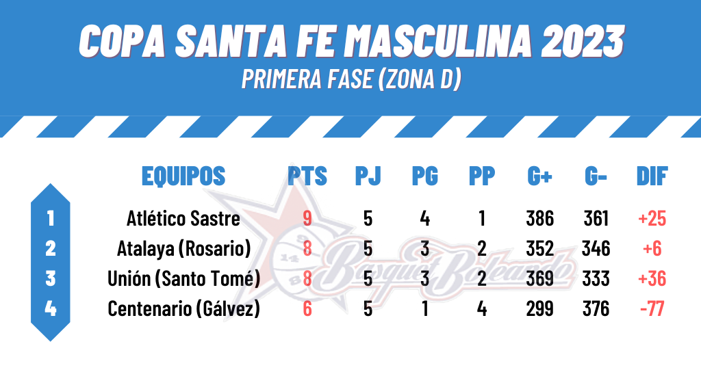 Atlético Sastre 75: Fabricio Caamaño 23, Bautista Peralta 18, Fernando Funes 14, Nicolás Crauzas 11, Matías Yácono 9 (FI) Stefano Vaudagna 0, Luciano Dalvecio 0, Juan Ignacio Balari 0, Tiago Colla 0. DT: Diego Ferrari