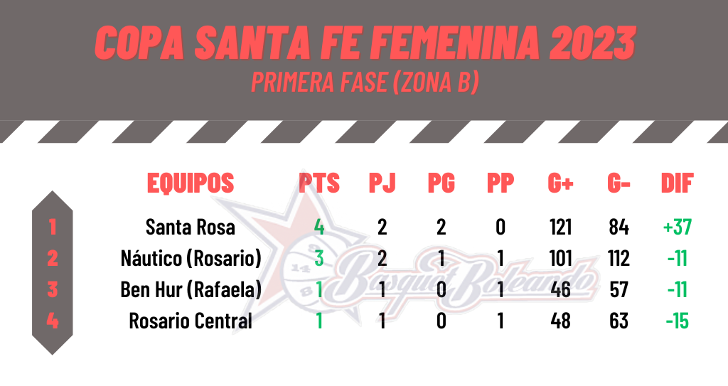 Santa Rosa (64): Martina Orbelli 5; Evelyn Caisso 2; Silvana Vico 3; Guillermina Berger 10; Johanna Puchetti 13 (FI); Rocío Mansilla 6; Delfina Zambrini 9; Anna Giorgio 9; Ana Paula Mina 5; Agustina Lang 5; Iara Baiche 2. DT: Diego Noe.