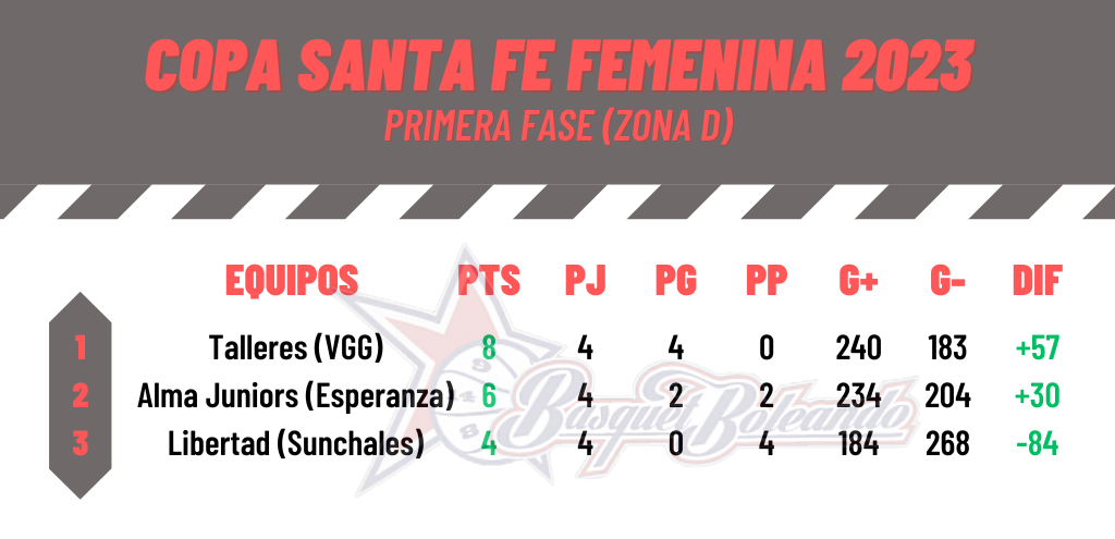 El conjunto esperancino doblegó 76-40 a Independiente de Ataliva en el duelo interzonal de la cuarta fecha correspondiente a la Copa Santa Fe Femenina. El local dominó de principio a fin y se quedó con un triunfo importante, no solo para acercarse a los Playoffs sino porque también se quedó «con la ventaja» ante su rival en caso de igualar posiciones en la general. Laura Rotta, con 18 puntos, fue la goleadora de la noche, bien acompañada por Malena Baum (12), Delfina Galván (12), Sofía Chelini (11) y Cora Minetti (8). Por su parte, en el equipo visitante, se destacaron Sol Paz (12) y Lucila Foglia (8).