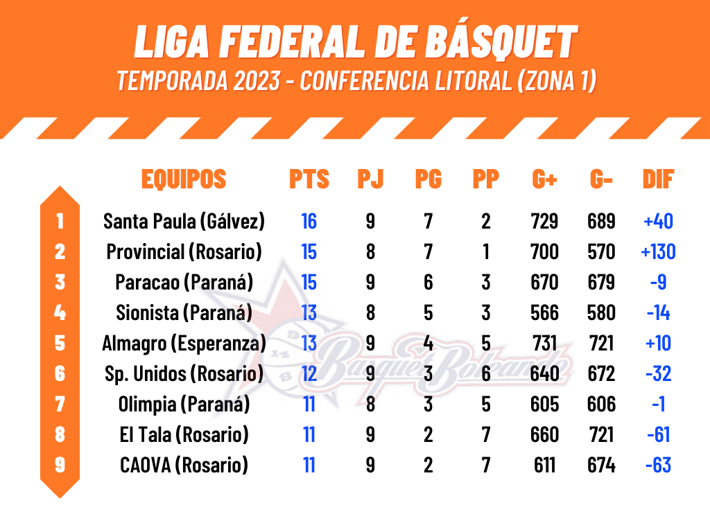 Almagro de Esperanza (84): Matías Felcaro 13; Leonardo Strack 9; Rodrigo Riquelme 5; Federico Pfeiffer 23; Martín Barlasina 5 (FI); Valentín Depetris 0; Diego Collomb 14; Enzo Durigón 8; Franco Parola 5. DT: Leandro Spies.