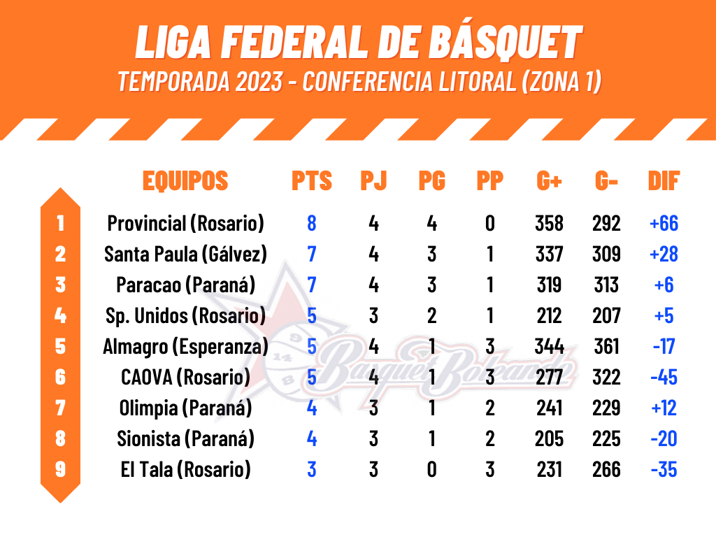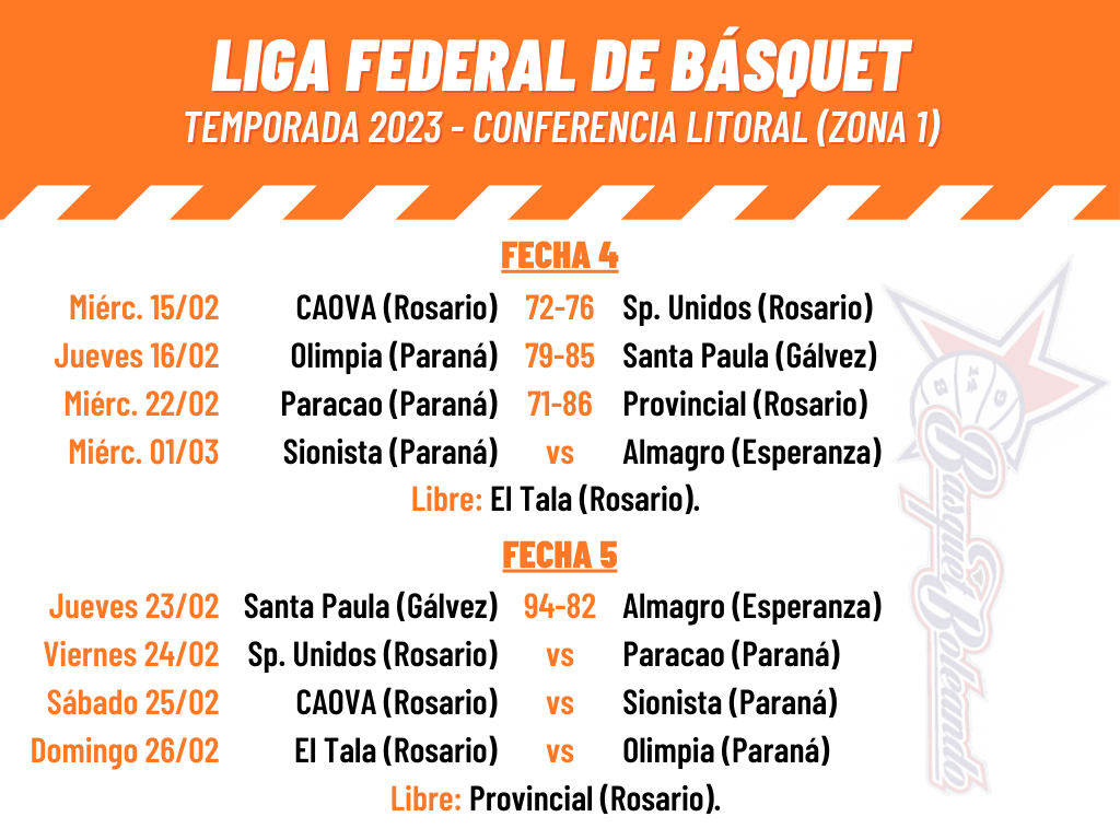 El conjunto esperancino cayó 94-82 ante el local Santa Paula en el juego que abrió la quinta fecha de la Zona 1 en la Conferencia Litoral. Los pupilos de Spies fueron competitivos en todo momento, llegaron a sacar luz de 9 promediado el primer tiempo y estaban al frente mientras se jugaba el tercer segmento. Entre Amprimo (2), Díaz Müller (7) y Vico (5) se encargaron de revertir la historia con un tremendo 14-0 en los últimos 4′ del 3C y así los dirigidos por Blanc lograron liderar el score y conservar la diferencia hasta la finalización del encuentro. Juan Pablo Stegmayer (22), Jerónimo Díaz Müller (20), Nicolás Solari (13) y Tomás Vico (10) lideraron las ofensivas en el vencedor mientras que Leonardo Strack (23), Rodrigo Riquelme (20), Matías Felcaro (17) y Facundo Viola (10) hicieron los propio en las águilas.