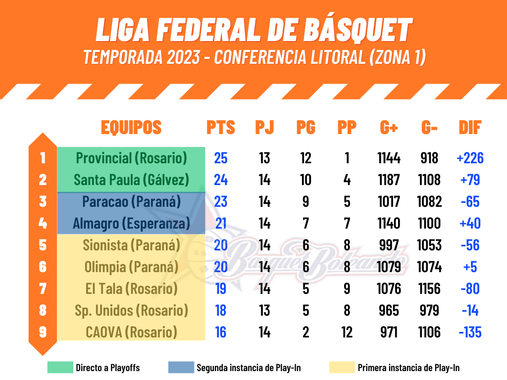 Almagro de Esperanza (82): Diego Collomb 14; Leonardo Strack 21; Rodrigo Riquelme 16; Federico Pfeiffer 6; Martín Barlasina 8 (FI); Matías Felcaro 14; Enzo Durigón 2; Valentín Depetris 1. DT: Leandro Spies.