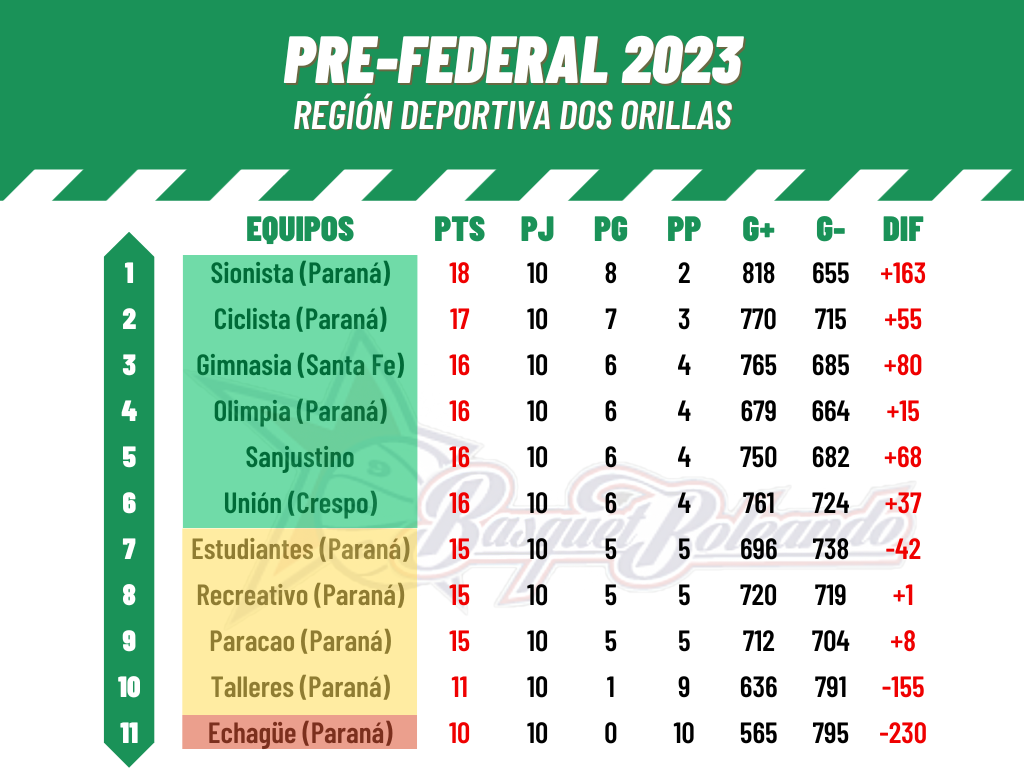 Este sábado se disputo la 11º fecha y última de la fase regular de la región “Dos Orillas” del Pre Federal. El triunfo destacado de la noche fue el de Olimpia en Crespo ante Unión por 77 a 69. Además, Ciclista venció sin sobresaltos a Talleres por 87 a 69. En tanto, que Recreativo con una gran reacción en el complemento, se impuso a Paracao por 65 a 50. Detalles.