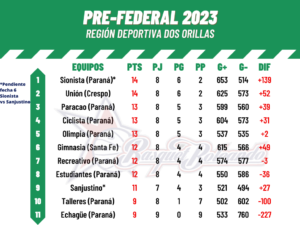 Este sábado se completó la novena fecha del Pre Federal “Dos Orillas” en Paraná. Ciclista le ganó sin sobresaltos a Estudiantes por 73 a 46. Además, Olimpia venció –como visitante- a Recreativo por 73 a 60. Por último, en un duelo clave para poder ingresar al Play-In, Talleres derrotó – a domicilio- a Echagüe por 75 a 54. Detalles.